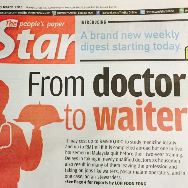 Today’s Star’s headline discussed several issues. Debts to be paid and huge investments that are going to waste, as the country is unable to provide housemanship post for at least 6 months to a year upon graduating. This waiting period will increase further when all the remaining medical schools (50% of them) start to produce doctors at their maximum capacity from next year onwards. I understand that they have started the e-housemen website.