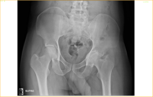 This X-ray of the Pelvis belongs to a 33-year-old man. He was diagnosed to have Rheumatoid Arthritis 2 years ago but was not managed properly. He was only treated with steroids and pain killers by many doctors. He came to see me with pain over the left hip and inability to walk properly over the last few months. This X-ray shows a severe destruction of the left hip-joint with eroded acetabulum, making the hip-joint to protrude into the pelvis. We call this condition as Petrusio acetabulum.